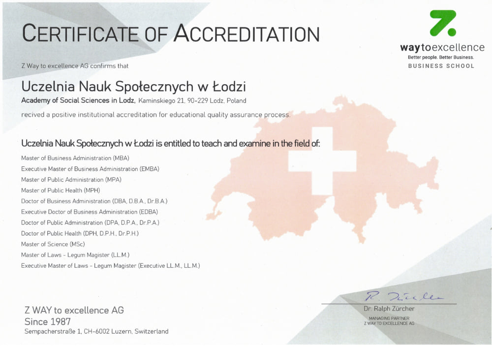 Післядипломне навчання магістра ділового адміністрування (Executive MBA), яке проводить Університет соціальних наук у Лодзі (Польща), має престижну акредитацію бізнес-школи Z WAY до досконалості (Швейцарія).